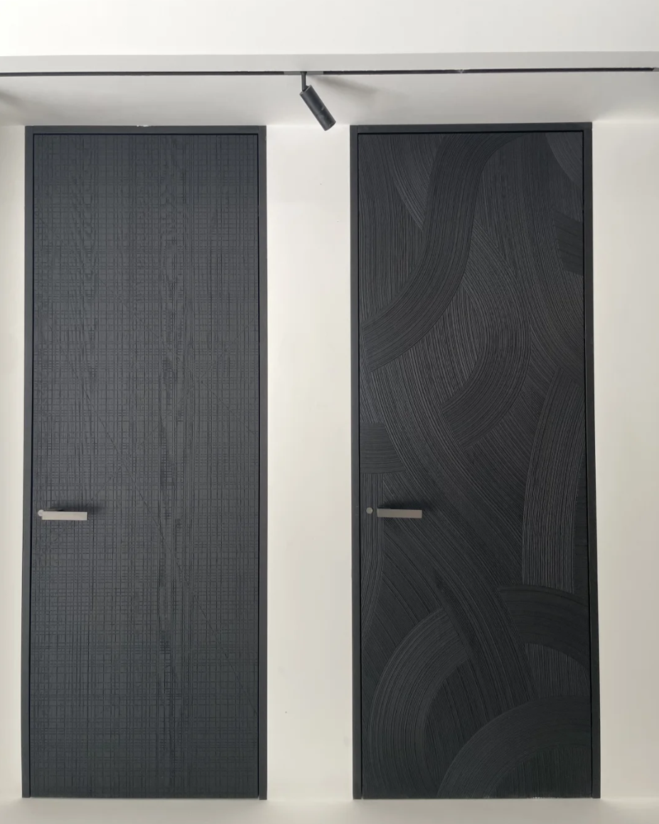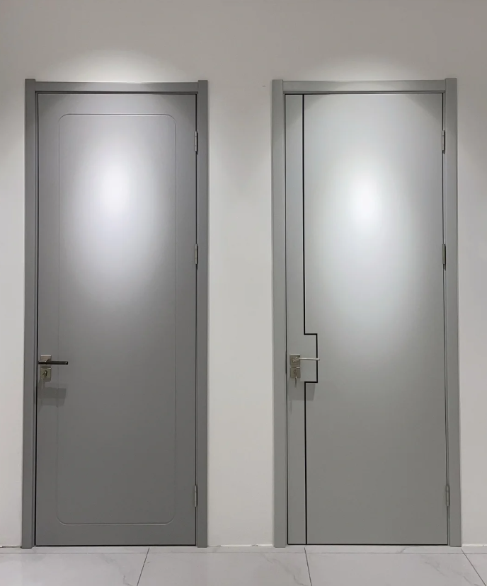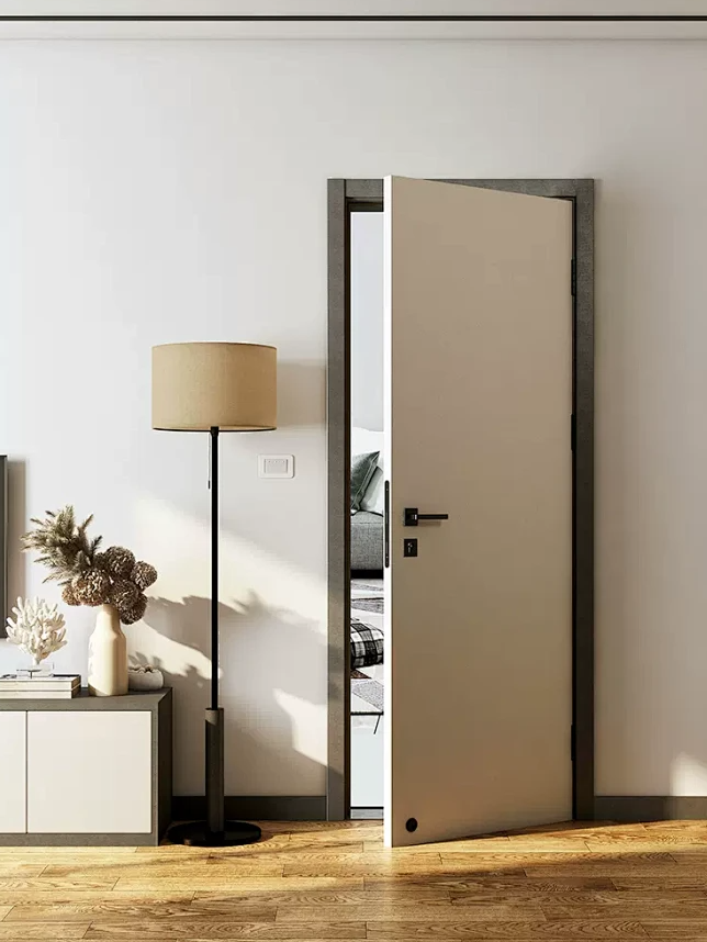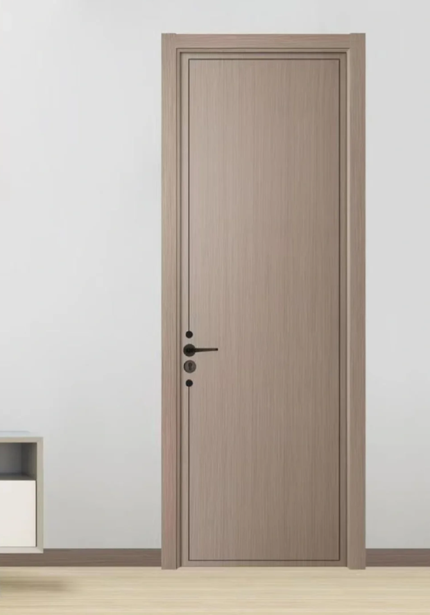 以密度板为基材,表面覆盖PVC膜或木皮,通过高温高压成型,价格相对便宜,但质感和环保性不如实木门。
