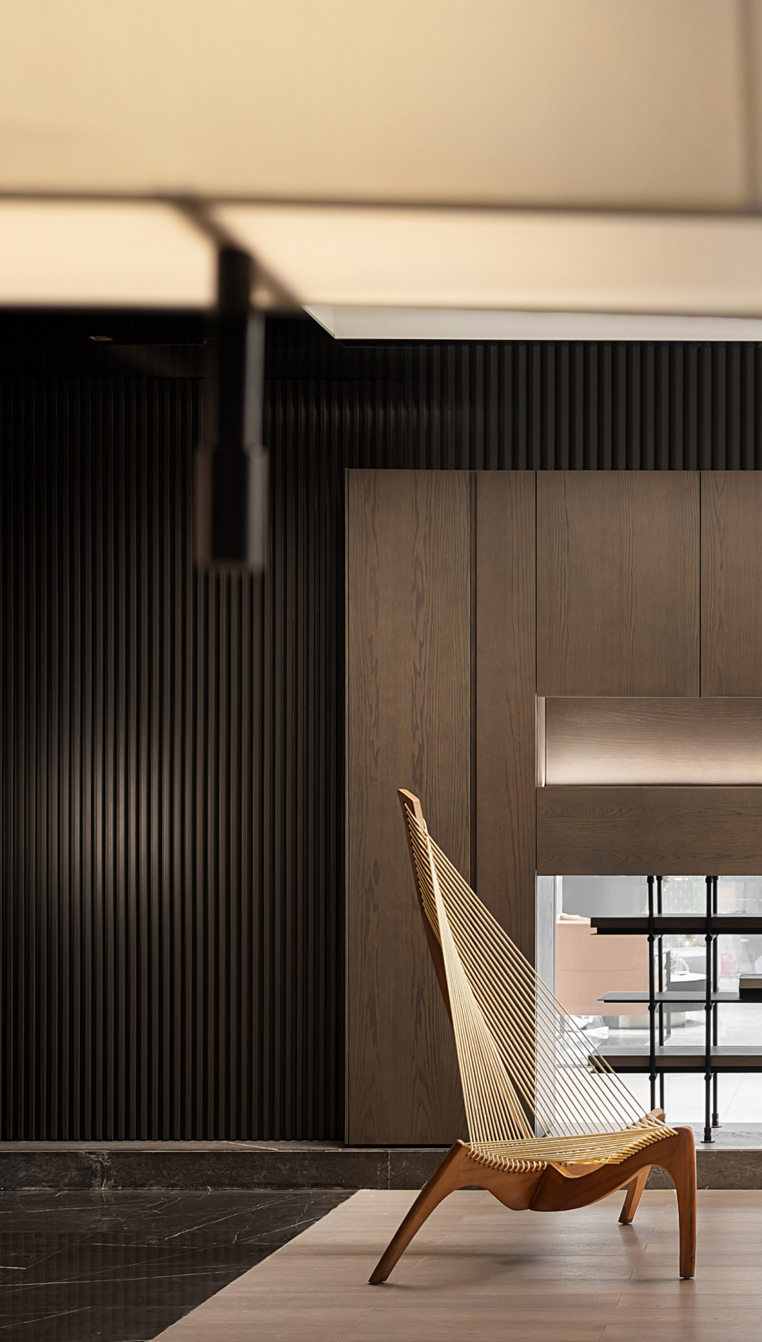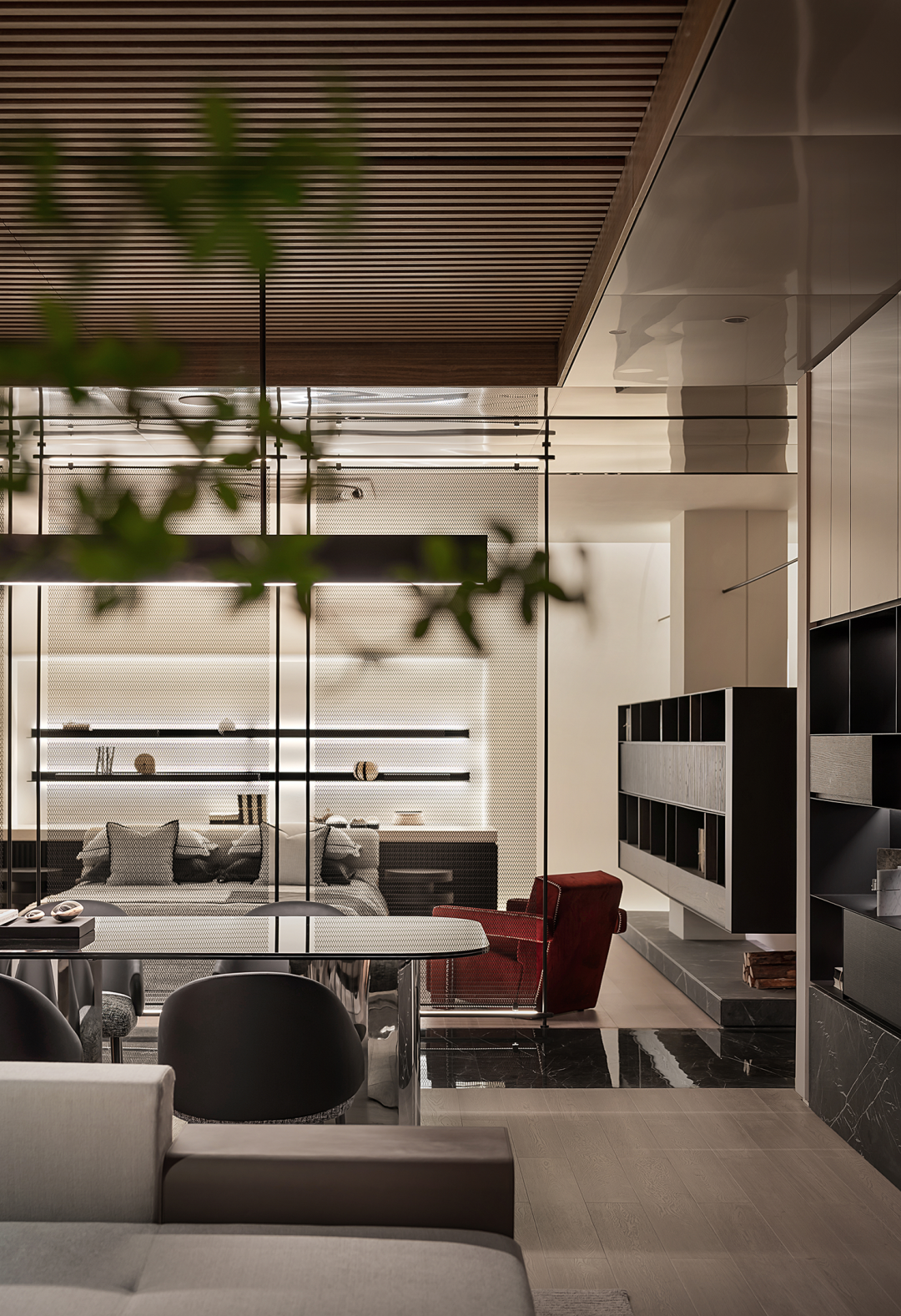 短暂的记忆,能让人超越空间性,获得时间性和自由。客厅与餐厅的开放式设计以“未知的自由”为基调,塑造一个自由的会客区域,将美好留给时间,留给未来,留给不确定的可能。天花的木格栅塑造简洁的线条美与韵律美,隐喻着自然,隐喻着本源,隐喻着诗性。